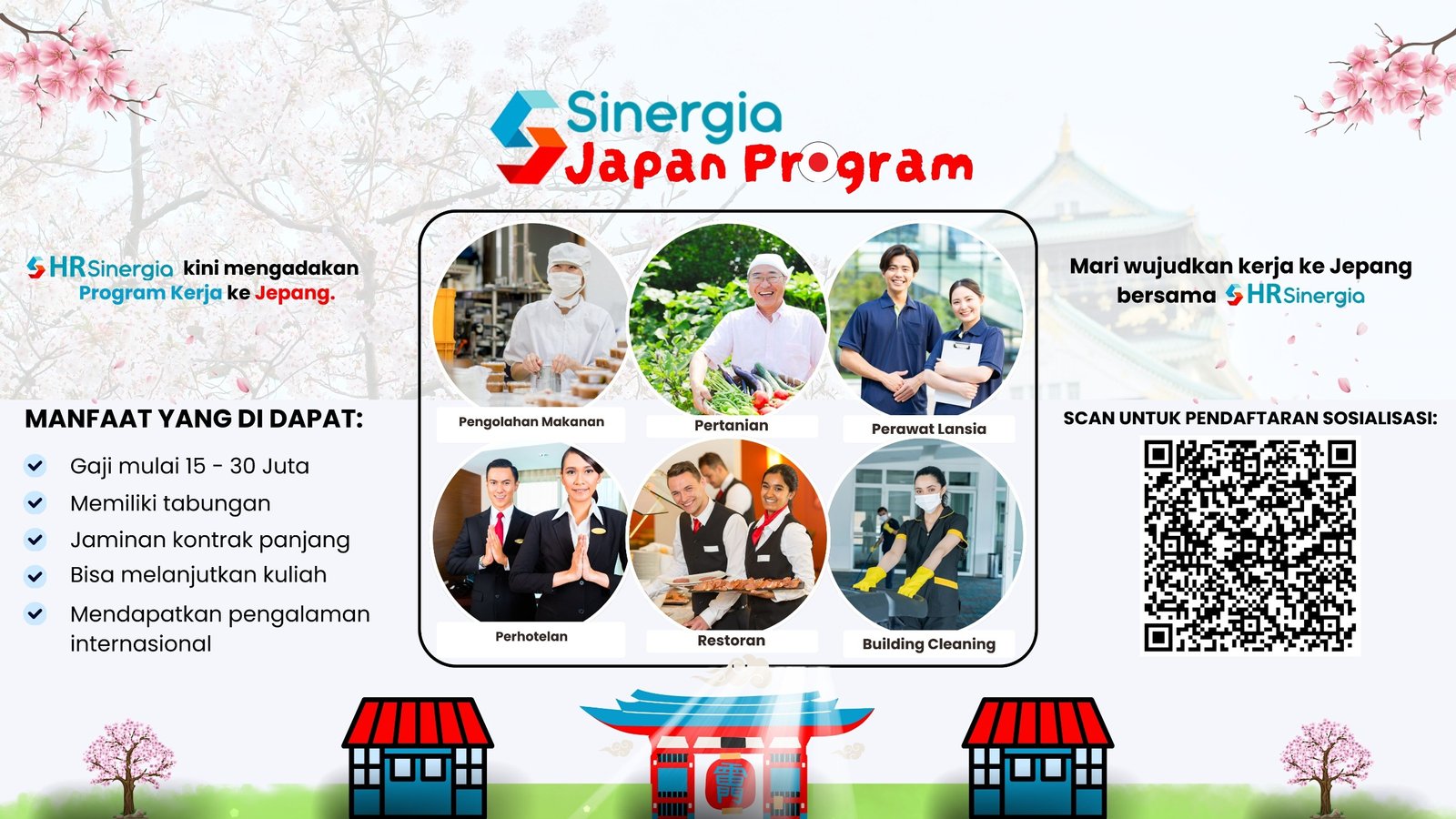 Sinergia Japan Program adalah pengembangan program HR Sinergia yang dirancang untuk memberikan pengalaman belajar dan bekerja di Jepang dengan persiapan yang matang dan biaya yang kompetitif. Peserta akan dibekali pelatihan Bahasa Jepang (JFT A2 Basic) serta pemahaman budaya kerja Jepang, sehingga lebih siap beradaptasi di lingkungan profesional Jepang