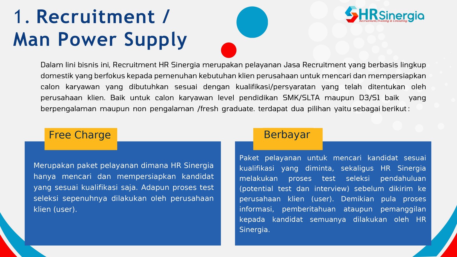 PAKET TIDAK BERBAYAR (FREE CHARGE): Adalah paket pelayanan dimana HR Sinergia hanya mencari dan mempersiapkan kandidat yang sesuai kualifikasi saja. Adapun proses tes seleksi sepenuhnya dilakukan oleh perusahaan klien (user).>