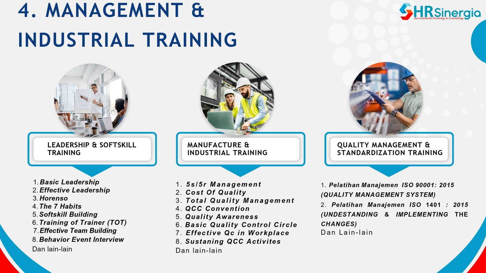Layanan yang diberikan oleh HR SINERGIA kepada perusahaan untuk melakukan program pelatihan (training). Adapun tema – tema training in house sebagai berikut :